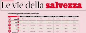 Possiamo dirlo, ormai manca poco prima che lo Spezia raggiunga un’altra storica salvezza, salvo clamorosi ribaltoni. Ma se in città qualcuno preferisce non sbilanciarsi finché non ce ne sarà l’aritmetica certezza, per qualcun altro la permanenza in A è praticamente cosa fatta. È l’esempio de La Gazzetta dello Sport in edicola questa mattina. La rosea si concentra infatti sulle squadre invischiate nella bagarre per la salvezza confrontando i rispettivi calendari. Sampdoria, Cagliari, Venezia, Genoa, Salernitana. Non c’è, come possiamo vedere dal grafico, lo Spezia.