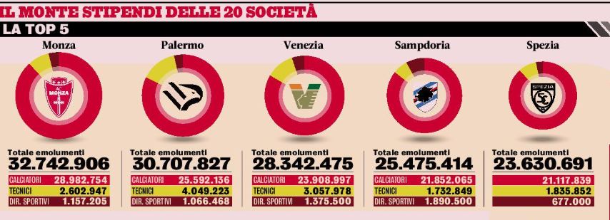 La situazione dello Spezia è particolare: con 23,6 milioni occupa la quinta posizione per emolumenti, ma nei bonus primeggia in assoluto nonostante un forte rosso di bilancio. Il club di Via Melara ne ha infatti incassati 4,2. In graduatoria Monza, Palermo, Venezia e Sampdoria sono davanti alle Aquile, mentre il Modena capolista è a quota 14 indietro.