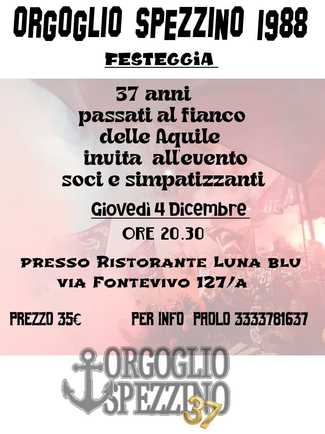 Una serata all’insegna della fratellanza quella andata in scena qualche sera fa da parte dei tifosi dello Spezia appartenenti allo storico club ‘Orgoglio Spezzino 1988’. Come scrive La Nazione, il sodalizio ha festeggiato i suoi 37 anni di vita e riporta le parole di uno dei fondatori, l’avvocato Massimo Lombardi: “Festeggiamo i 37 anni di vita insieme, di una famiglia indissolubile di amici, innamorati pazzi della maglia bianca. Un manipolo di giovani e meno, abituali frequentatori della curva, legati dall’appartenenza ai quartieri a est della città e dalla fierezza di esser spezzini, non solo allo stadio, ma nella vita di tutti i giorni, cultori del dialetto spezzino, delle tradizioni popolari e sempre pronti ad iniziative di volontariato e solidarietà, a Spezia e nel mondo intero”.