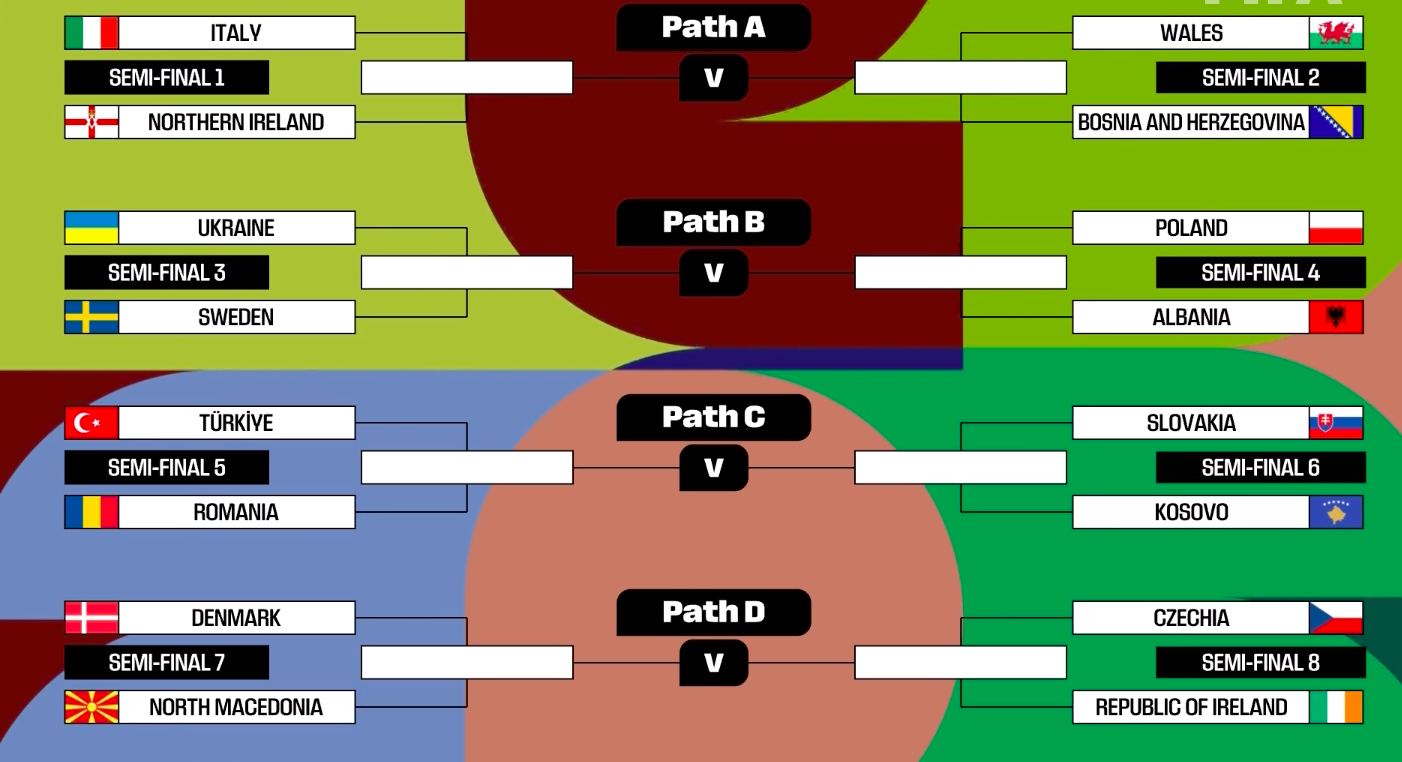 Semifinale in casa, secca. Finale a sorteggio, altrettanto secca. Due partite per decidere il prossimo futuro dell’Italia, costretta a giocarsi l’accesso al Mondiale 2026 attraverso i play-off già fatali in due occasioni su due. Gli Azzurri potevano pescare dalla quarta fascia (per la semifinale) una tra Macedonia, Svezia, Irlanda Del Nord e Romania, affrontando poi in una eventuale finale una vincente fra Galles e Bosnia. Quattro lotti diversi che daranno altrettante qualificate alla prossima rassegna in America.