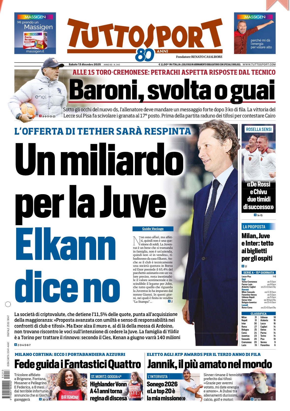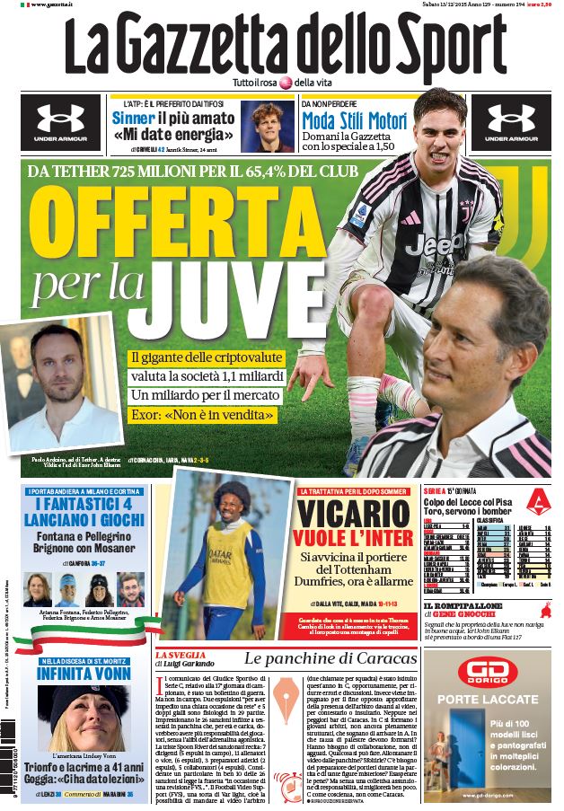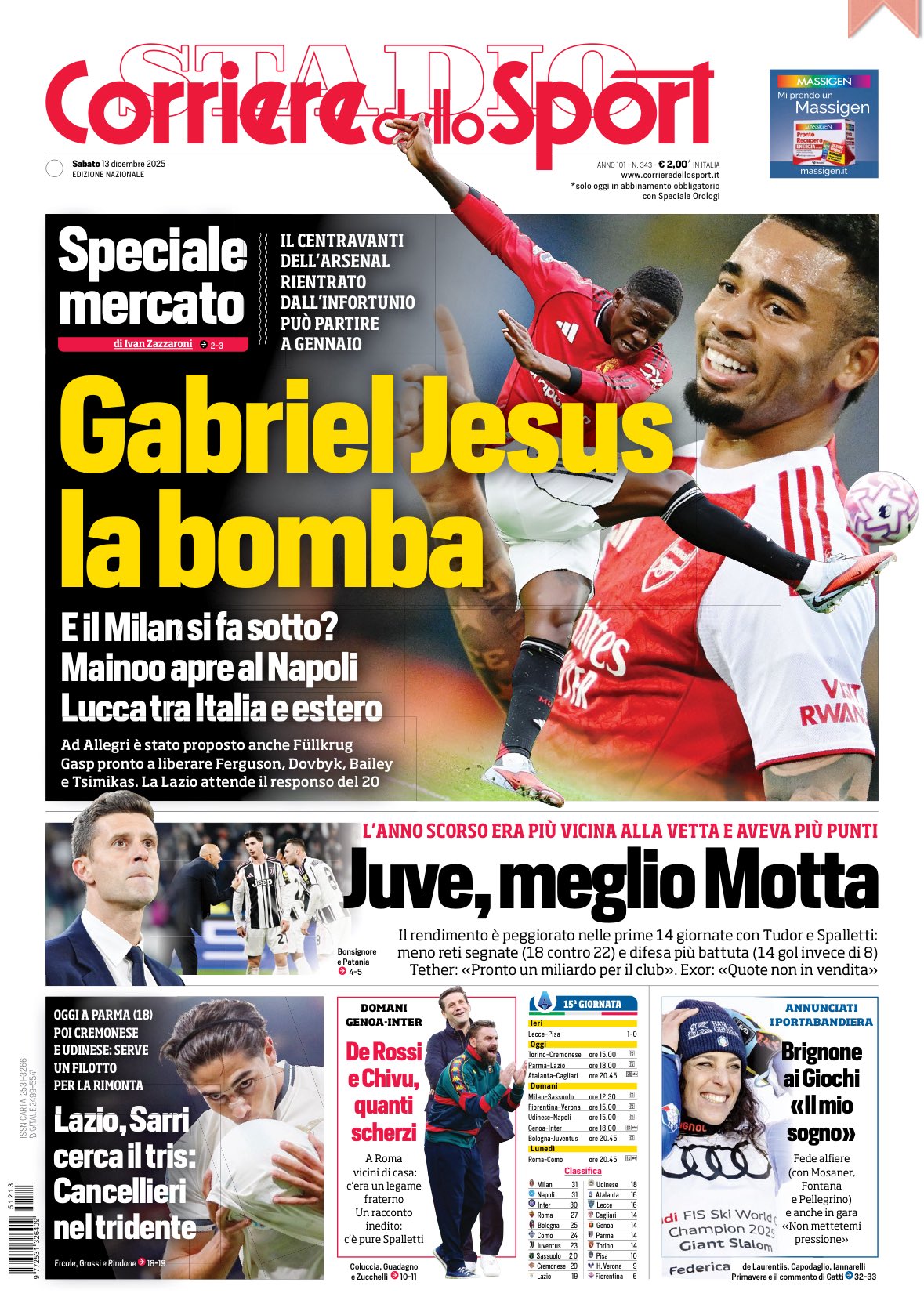 Le copertine dei quotidiani sportivi in edicola oggi, 13 dicembre 2025