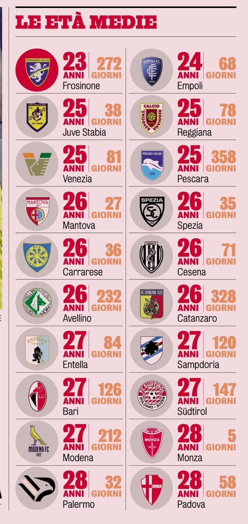 Nello schema del quotidiano sulle età medie della categoria, lo Spezia occupa l’ottava posizione con 26 anni e 35 giorni, subito davanti alla Carrarese (36 giorni) e dietro al Mantova (27 giorni). I bianchi hanno alzato l’asticella, puntando su maggiore esperienza, ma al momento l’idea non sembra dare gli effetti sperati.