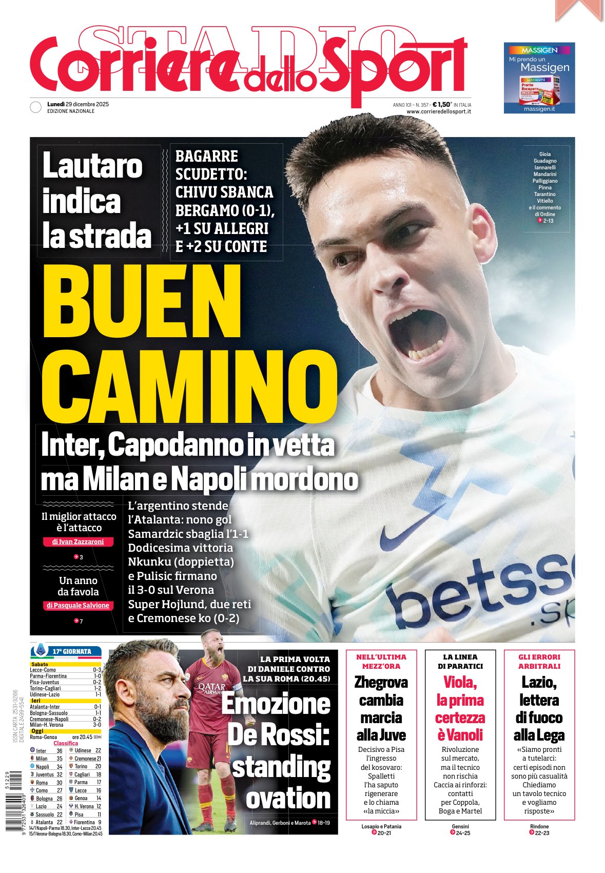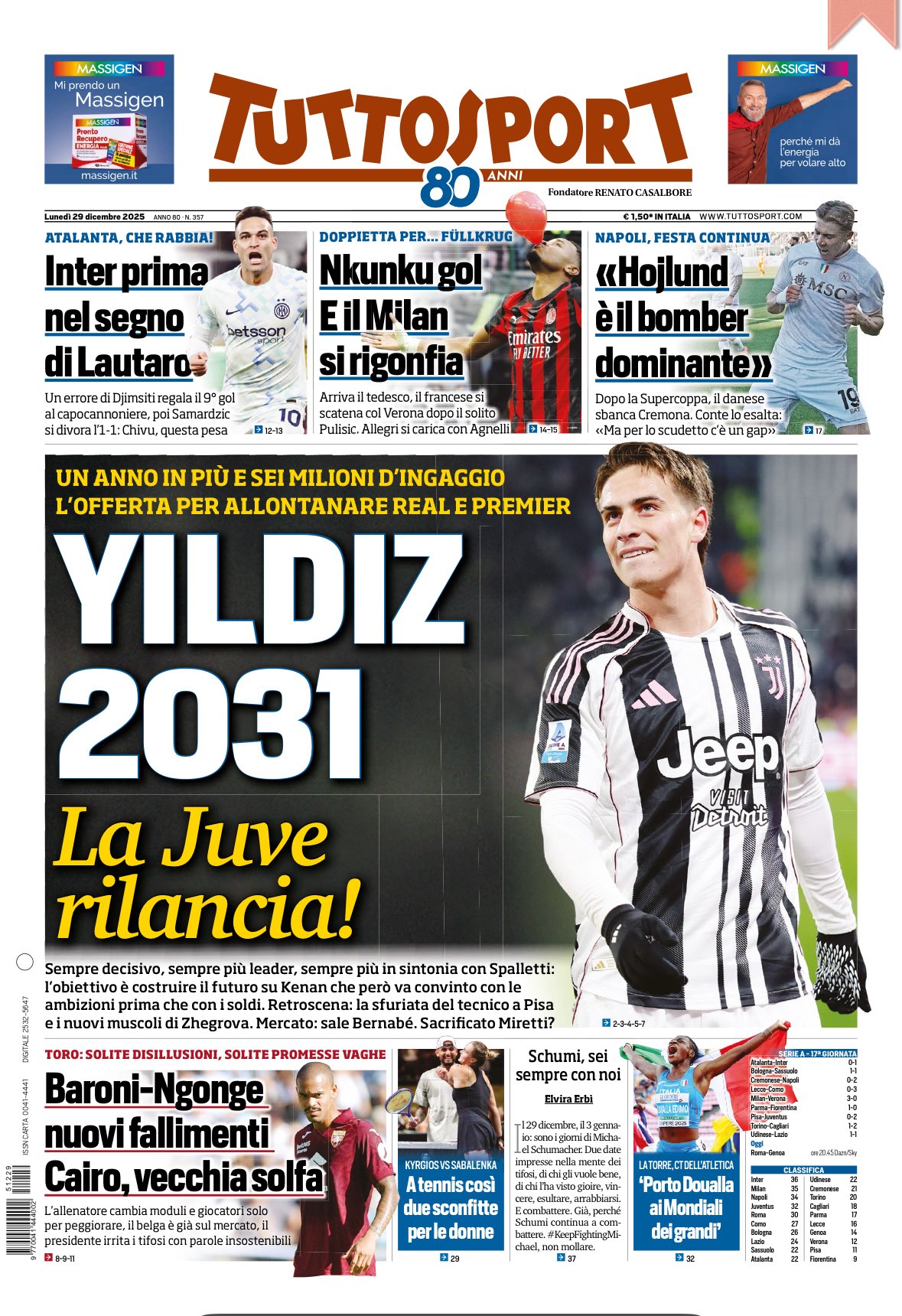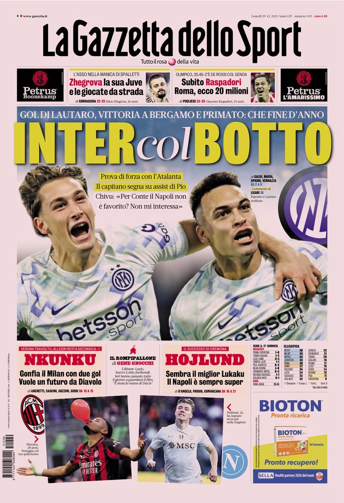 Le copertine dei quotidiani sportivi in edicola oggi, 29 dicembre 2025