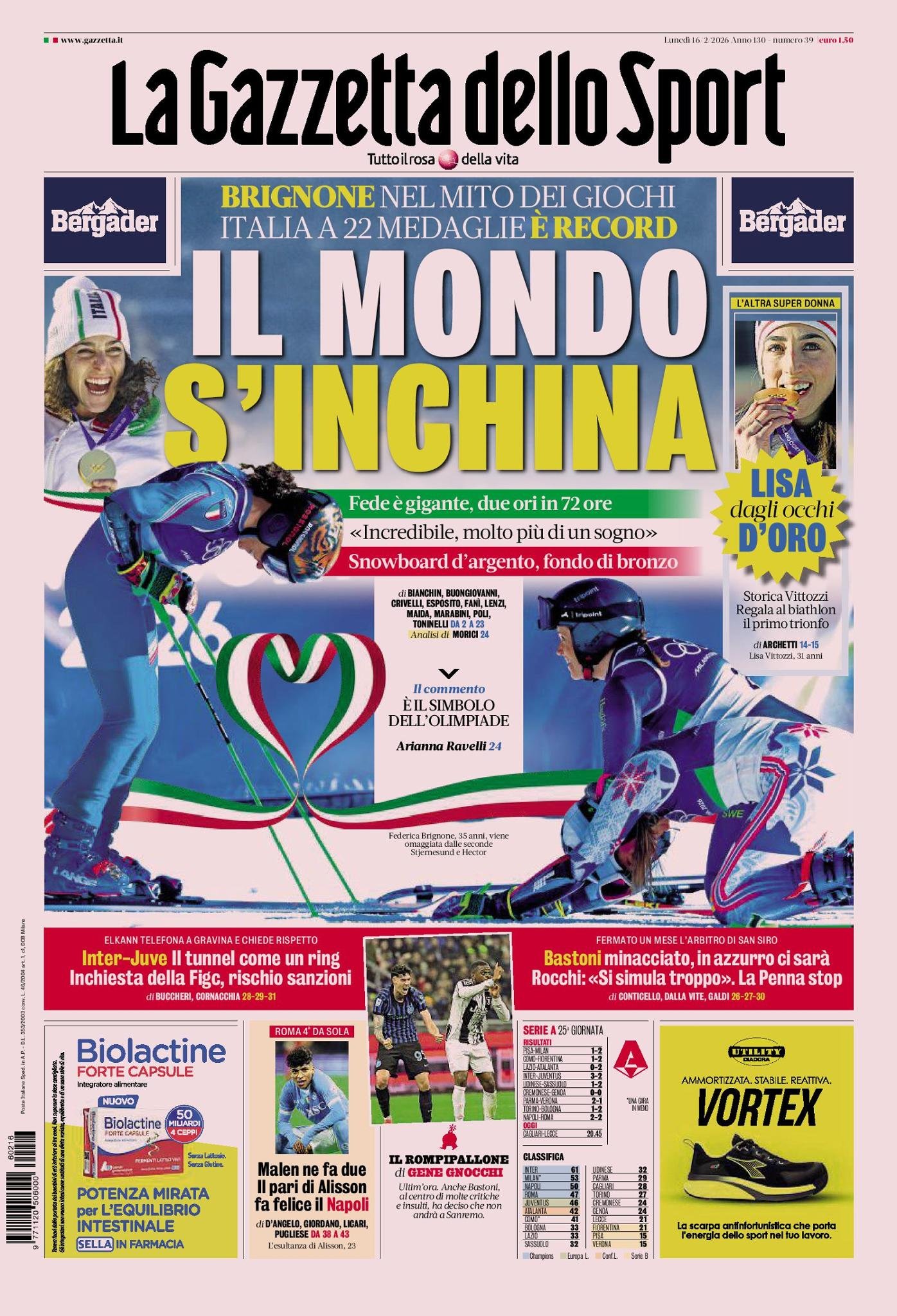 Le copertine dei quotidiani sportivi in edicola oggi, 16 febbraio 2026
