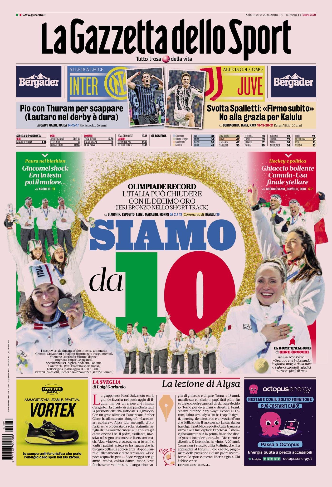 Le copertine dei quotidiani sportivi in edicola oggi, 21 febbraio 2026