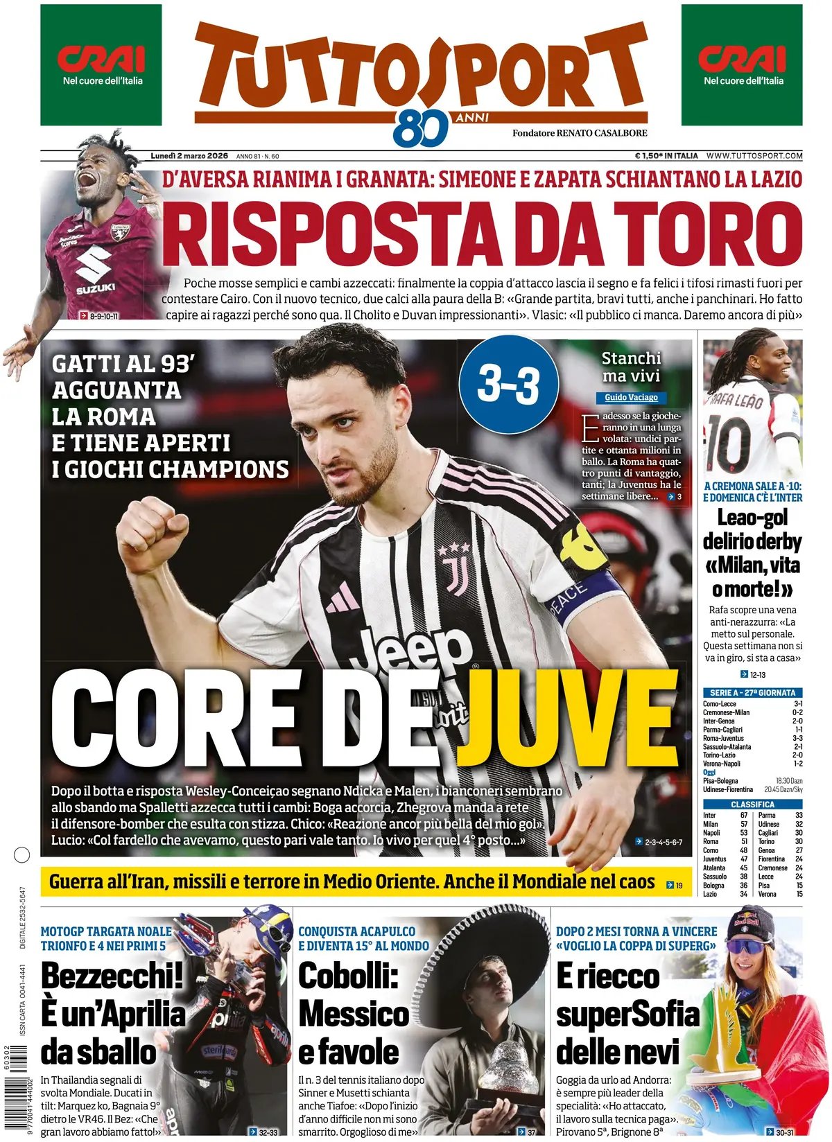 Le copertine dei quotidiani sportivi in edicola oggi, 2 marzo 2026