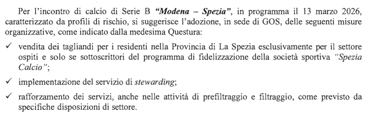 Si prospettano limitazioni per i tifosi dello Spezia in occasione della trasferta sul campo del Modena in programma la prossima settimana. L’ONMS ha infatti identificato la gara del Braglia come una di quelle a rischio in tema di ordine pubblico. L’Osservatorio, nel dispositivo pubblicato in queste ore, ha infatti suggerito (oltre all’implementazione di steward e prefiltraggio e filtraggio) l’apertura del settore ospiti solo per i residenti in provincia della Spezia e possessori di Eagle Card.