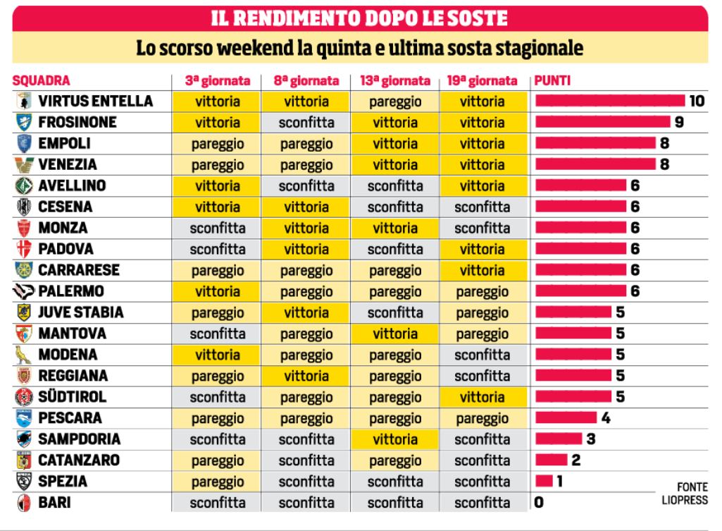 A sorpresa, a comandare la classifica c’è una squadra che lotta per salvarsi come l’Entella, in grado di totalizzare ben dieci punti dopo le soste con tre vittorie e un pari. I chiavaresi sono seguiti dall Frosinone (9) e dall’accoppiata Empoli-Venezia (8). E la Carrarese? La prossima avversaria dello Spezia vanta 6 punti all’attivo, con tre pareggi e un successo. I marmiferi di Calabro non hanno infatti mai subito sconfitte in questa particolare situazione. Un altro elemento di cui tenere di conto nella gara del Dei Marmi.